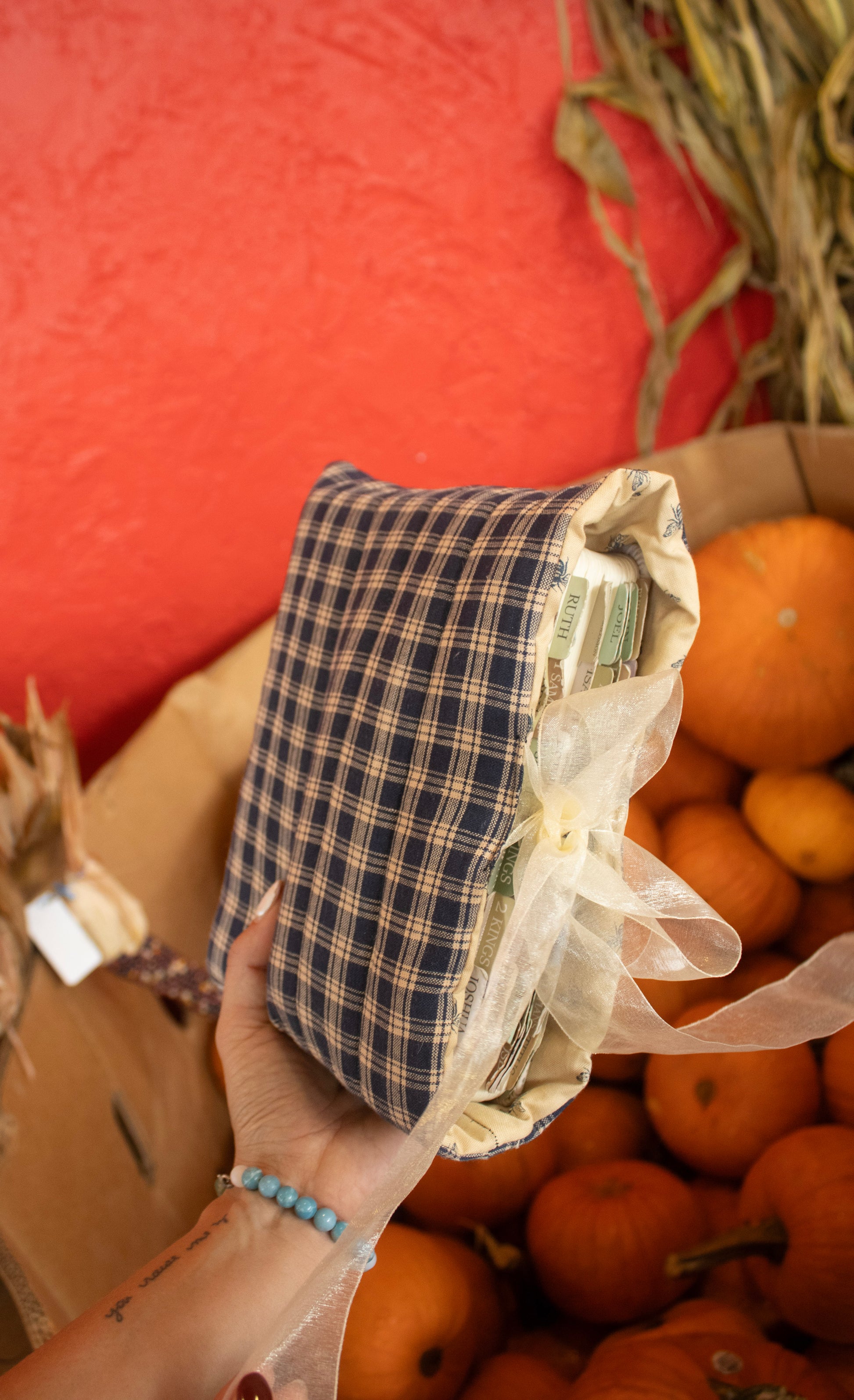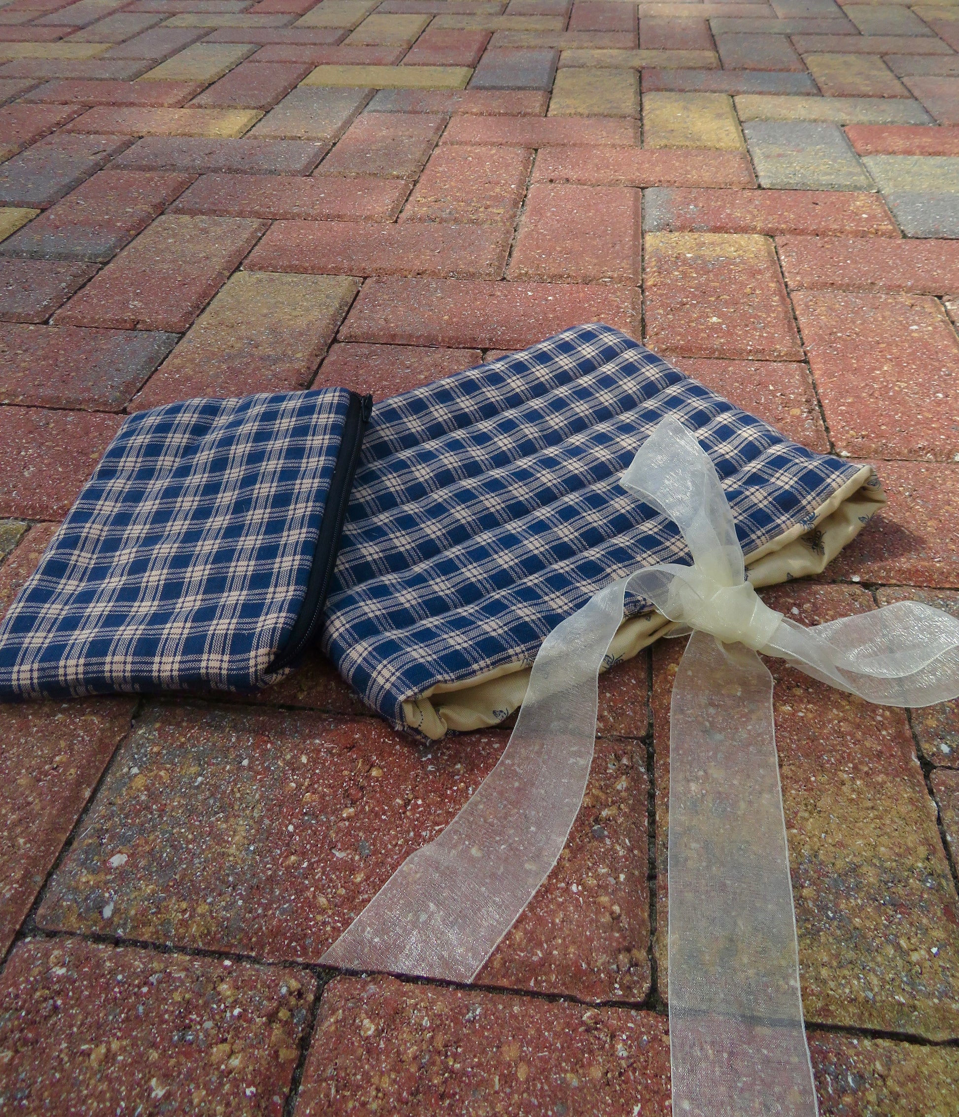 A beautifully handcrafted bible cover with a navy blue and beige gingham pattern